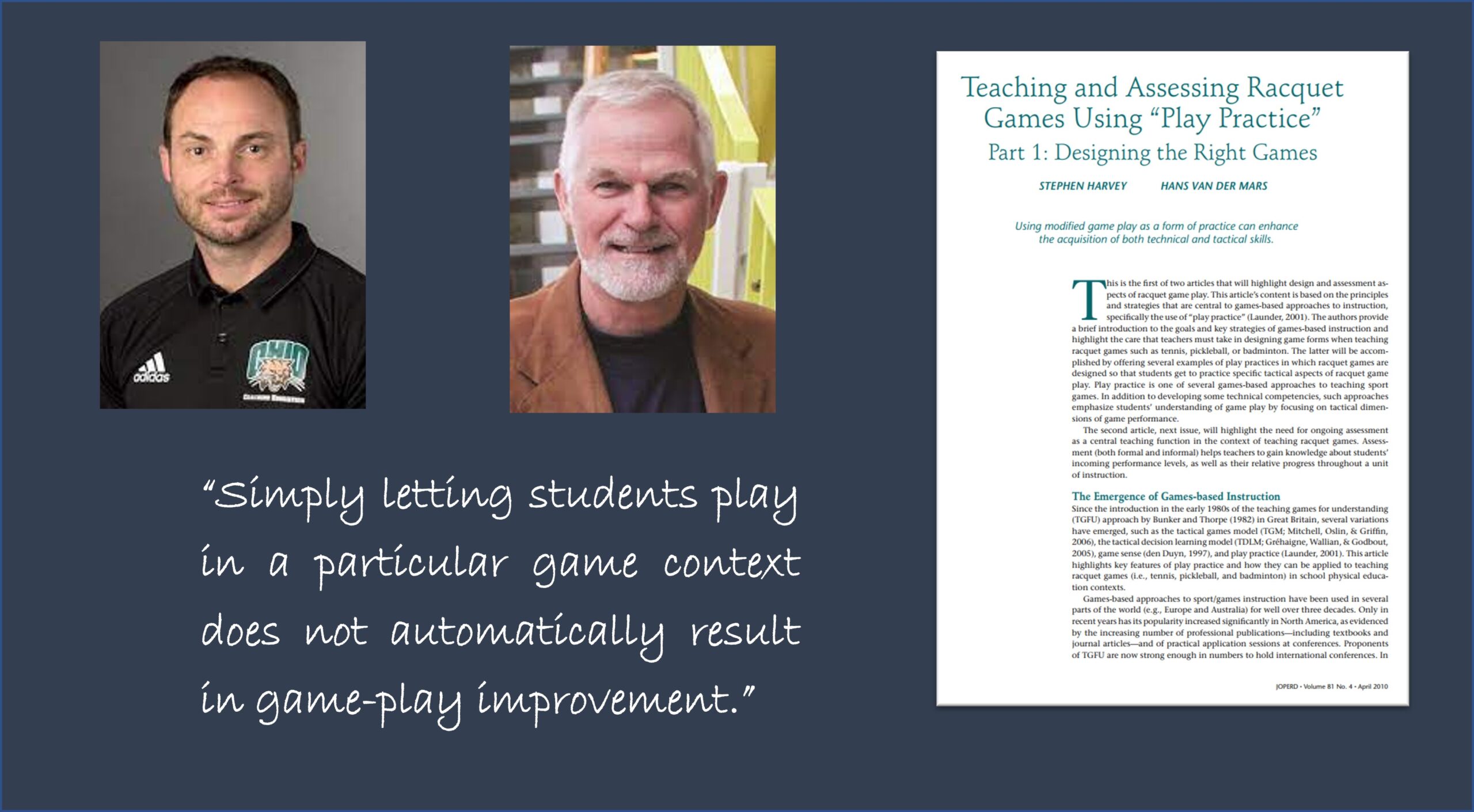 Click on this image to read this paper: Teaching and Assessing Racquet Games Using “Play Practice” – Part 1: Designing the Right Games. The authors are Stephen Harvey Hans van der Mars