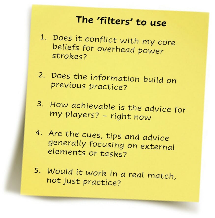 Below I’ve listed some questions that you could ask about information to see, hear or maybe create yourself. These will act as filters to ensure that what you are left with is useable and effective to help players develop overhead forehands.