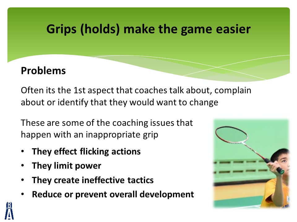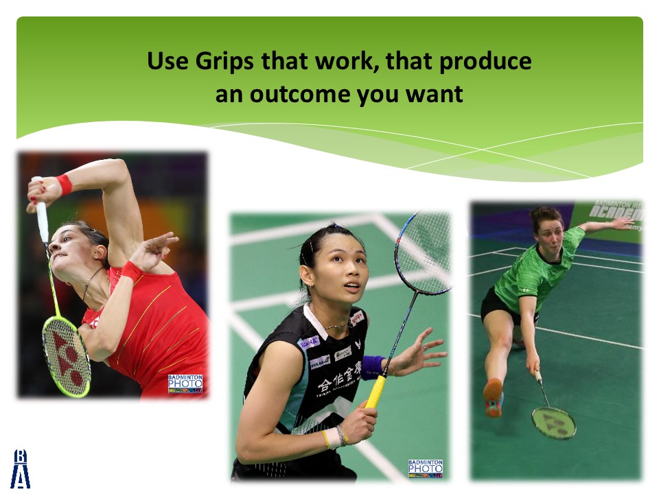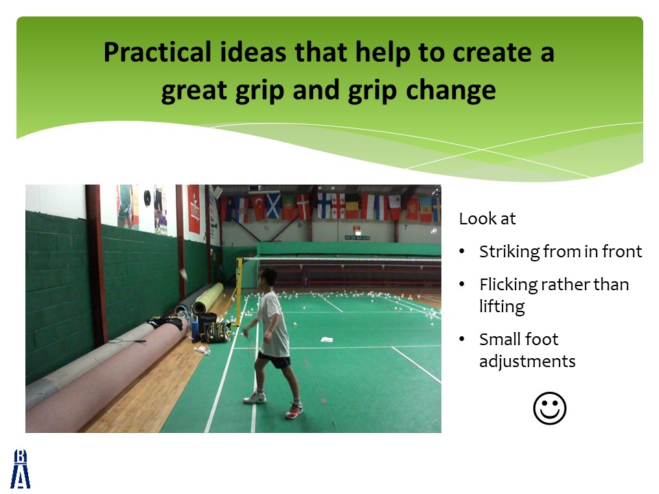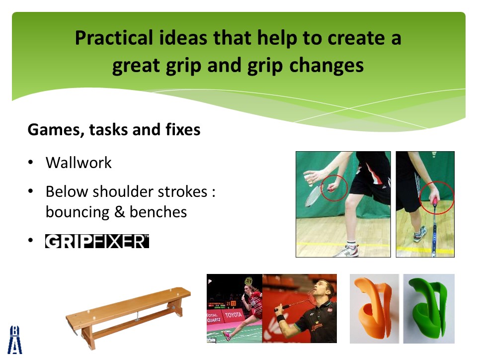 The slides are accompanied by 4 videos that can all be found at the bottom of this post.  Each video will give you some ideas to create an effective badminton grip from the beginning of a player’s journey.