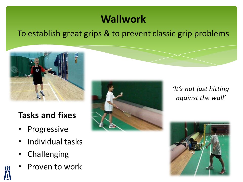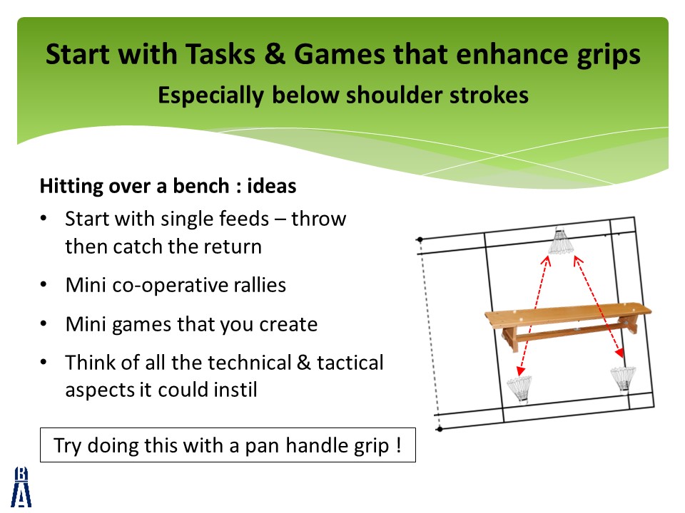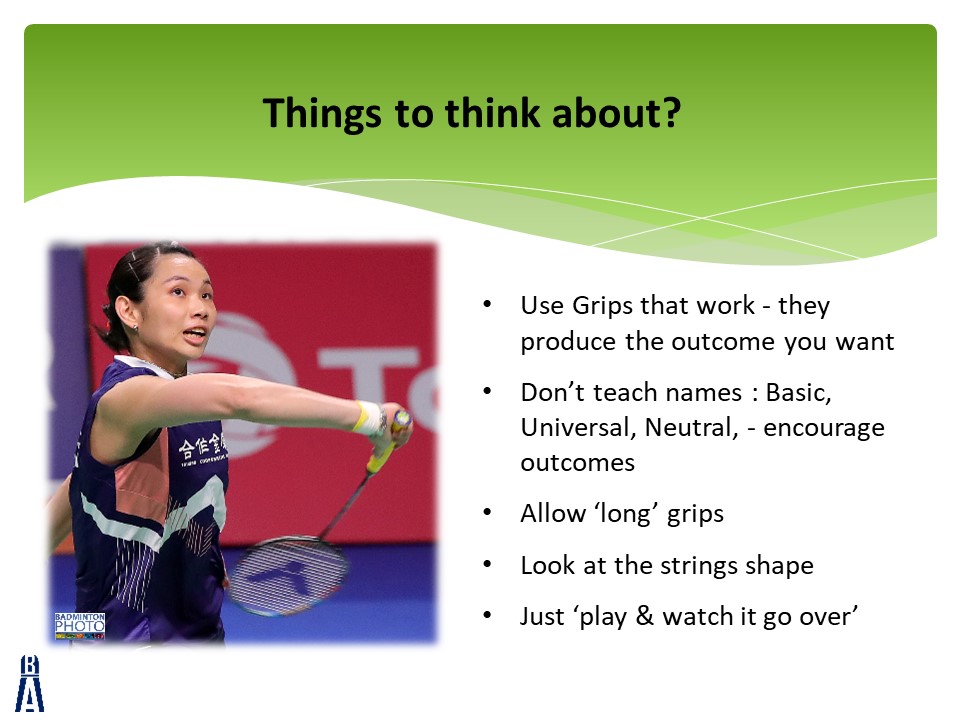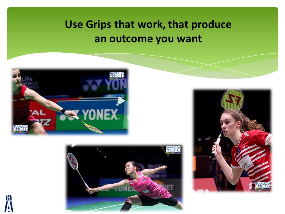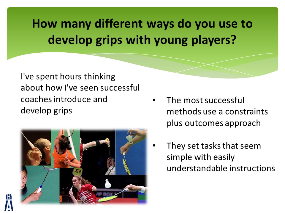 The slides are accompanied by 4 videos that can all be found at the bottom of this post.  Each video will give you some ideas to create an effective badminton grip from the beginning of a player’s journey.